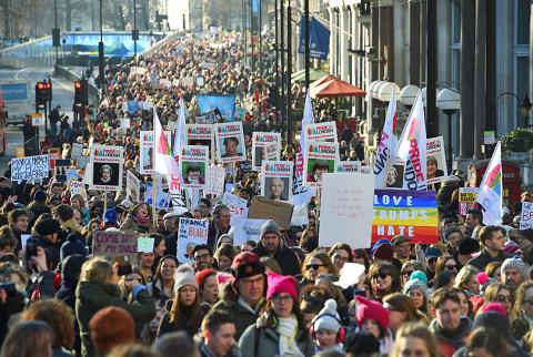 In the UK, from 80,000 to 100,000 people joined the Women’s March on London, with another 14 marches in towns and cities across Britain, including Manchester, Cardiff, Edinburgh, Liverpool, Leeds and Belfast.