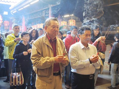 Accompanied by temple vice chairman Cheng Ming-kun (鄭銘坤), former KMT vice chairman Steve Chan (詹啟賢) arrived at 9am to pay homage to the goddess of the sea.