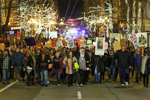 Protests were held at numerous airports and cities around the nation, including one outside the Trump International Hotel in Washington.