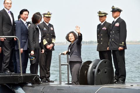 During the ceremony, Tsai boarded the Hai Lung-class submarine the Hai Hu in Zuoying Military Harbor to watch a simulation of a torpedo launch.