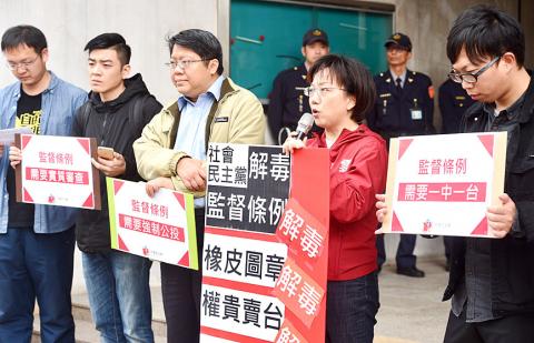 “This is an important bill which does not just address internal administrative questions,” said Economic Democracy Union convener Lai Chung-chiang (賴中強), who was part of the Sunflower movement, at a rally outside the Legislative Yuan in Taipei with Social Democratic Party (SDP) activists. “Allowing legislators from all related committees to be included in discussions and to propose substantial amendments is the right direction.”