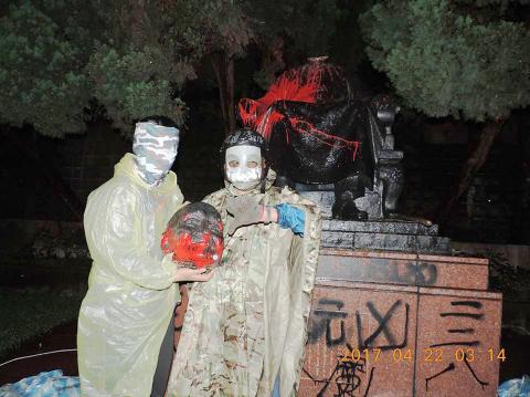 The statue in Yang-ming Park was beheaded and had red paint smeared over it with a message saying: “228 mastermind” and “serial killer.”
