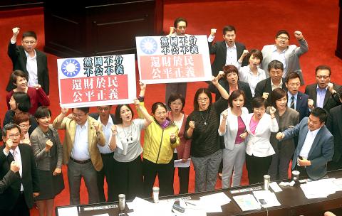The legislature approved the Act on the Settlement of the Combination of Years of Service in Public Sector and Political Organizations (公職人員年資併社團專職人員年資計發退離給與處理條例), which when promulgated requires people paid a pension for the time they spent working for the KMT and non-governmental organizations to return the excess payments within one year.