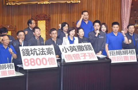 With the Economics Committee scheduled to lead a second joint-committee review of the bill today, the KMT caucus staged a protest against what it called the NT$880 billion (US$29.3 billion) “money-pit bill,” demanding a redrafting of the bill to reduce the expenditure and shorten its target period from eight years to four.