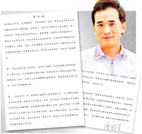 Chen said in a statement that he is not Lee Kuo-hua (李國華), a character in Lin’s novel published in February last year.