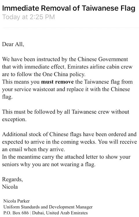The e-mail, sent on Tuesday morning by the company’s Uniform Standards and Development Manager Nicola Parker, said that the company was “instructed by the Chinese Government that with immediate effect, Emirates airline cabin crew are to follow the One China policy.”