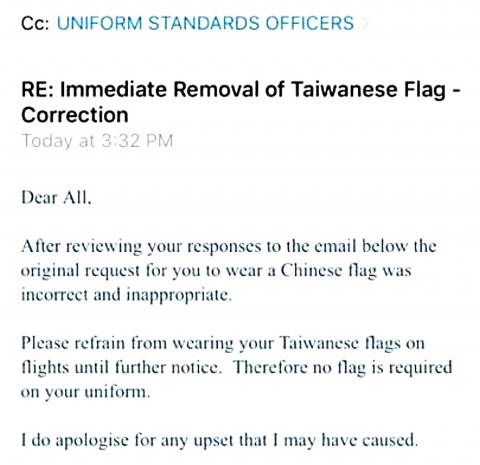 “Please refrain from wearing your Taiwanese flags on flights until further notice. Therefore no flag is required on your uniform,” the e-mail said.