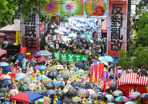 A steady downpour failed to deter hordes of retired public-school teachers, civil servants and military personnel from packing Jinan Road and portions of neighboring side streets for several hours, maintaining a steady staccato of whistle-blowing and chants for President Tsai Ing-wen (蔡英文) to step down.