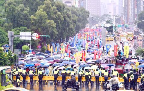 Long lines of police officers shadowed protesters throughout their march, with special barricades erected along the Zhongxiao Road and Zhongshan Road intersection to prevent demonstrators from attempting to repeat a previous occupation of the legislative compound.