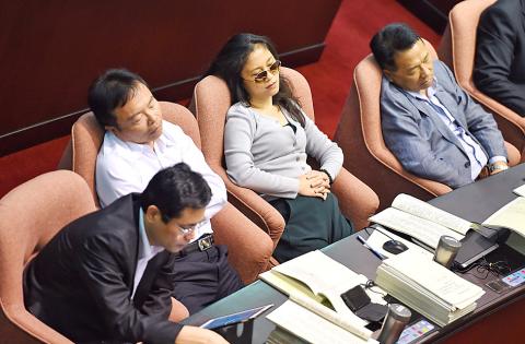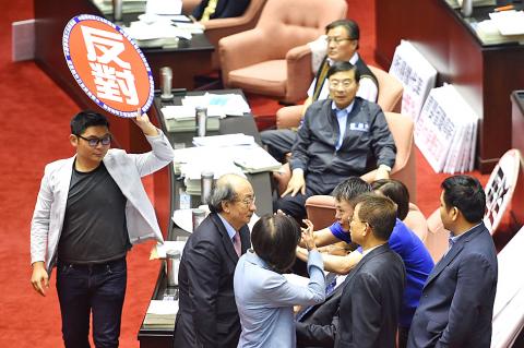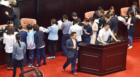 Legislators for and against the pension reform gave speeches in between the votes, with the KMT caucus criticizing President Tsai Ing-wen’s (蔡英文) pension reform plan.