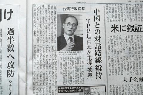 Taiwan has a relatively strong economy and its participation would be beneficial to the TPP, he said, adding that the nation also hopes to develop closer trade ties with Japan, other TPP nations, the US and the EU, and to reduce tariffs in bilateral trade.