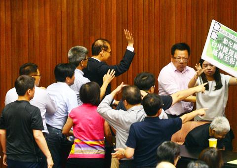 Scuffles broke out at the legislature yesterday before Premier Lin Chuan (林全) was scheduled to brief legislators on the budget for the Forward-looking Infrastructure Development Program.