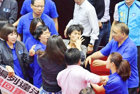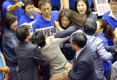 In one of the more dramatic moments Chinese Nationalist Party (KMT) Legislator Hsu Shu-hua (許淑華) slapped Democratic Progressive Party (DPP) Legislator Chiu Yi-ying (邱議瑩) across the face.