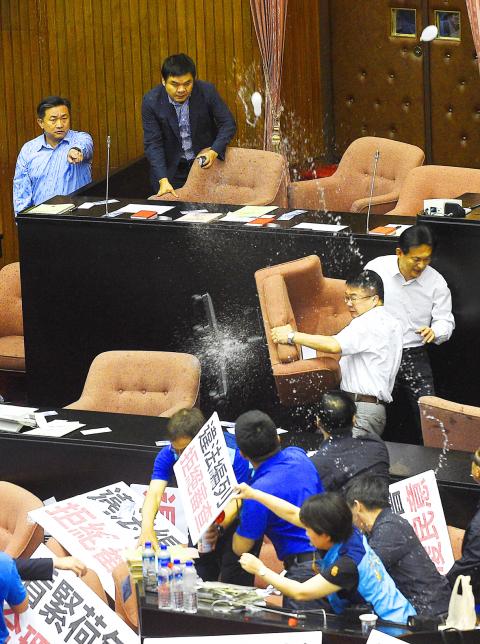 DPP Legislator Chuang Ruei-hsiung (莊瑞雄) threw water from a vacuum flask at KMT lawmakers, who hit back with water balloons. Chuang then lifted up a chair and threatened to hurl it toward his KMT colleagues.