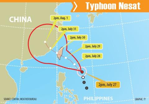Tropical Storm Nesat is to make landfall in Taitung tomorrow or Sunday, and a sea alert would be issued in the morning at the earliest, the Central Weather Bureau said yesterday.