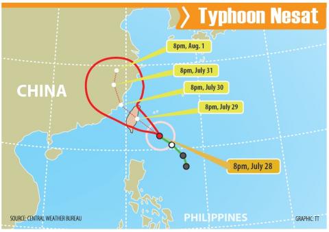 As of 6:15pm yesterday, Nesat’s eye was 440km southeast of Hualien County with a radius of 150km and moving northwest at 16kph.