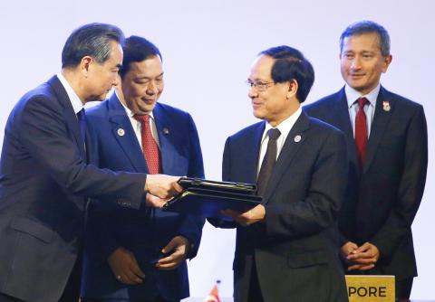 Earlier in the day, the foreign ministers of ASEAN and their Chinese counterpart, Wang Yi (王毅), adopted a negotiating framework for a code of conduct in the South China Sea, a move they hailed as progress, but was seen by critics as a tactic to buy Beijing time to consolidate its maritime power.
