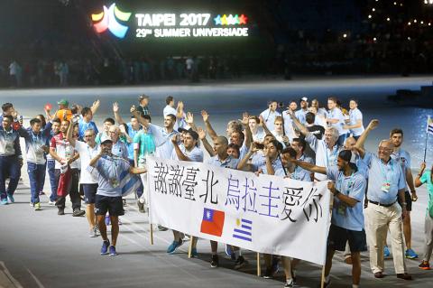 Uruguayan athletes held up a banner that read: “Thank you, Taipei, Uruguay loves you” written in traditional Chinese characters and with a flag of the Republic of China and Uruguay, which was cheered by the audience.