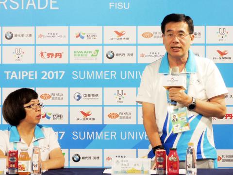 At a separate news conference, Huang Sung-chen (黃嵩琛), head of the Taipei Universiade Organizing Committee’s security department, said there were many pension reform protesters sounding air horns and throwing smoke bombs outside Taipei Municipal Stadium on Saturday night, forcing the athletes to wait in a holding area.