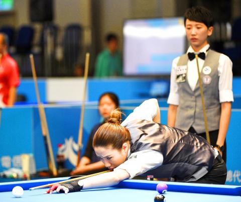 In women’s 9-ball doubles, Wei Tzu-chien (魏子茜) and Kuo Szu-ting (郭思廷) faced off against South Korea’s Jang Yoon-hye and Jeong Eun-su at the Taipei Flora Expo Dome.