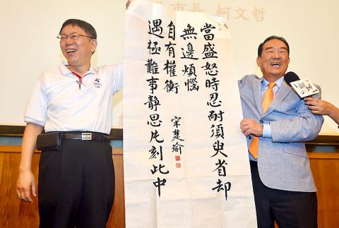 He also presented Ko with a phrase he rewrote from a piece by calligraphy master Yu You-ren (于右任) and encouraged the mayor to be patient, keep his temper when angry and deal with difficulties calmly.