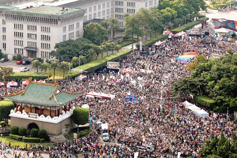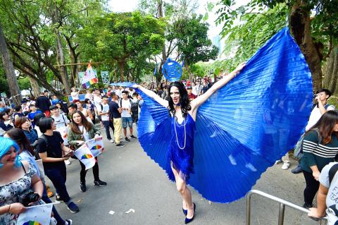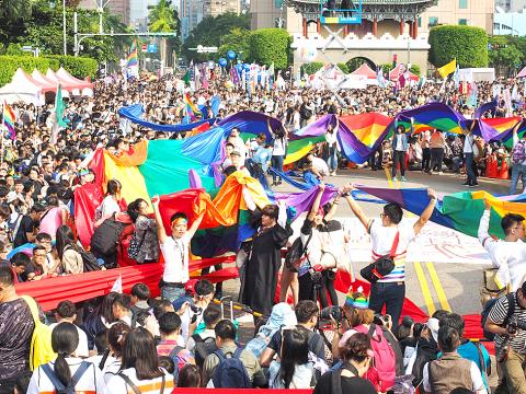 At about 1pm yesterday, paraders flooded toward the event’s main stage on Ketagalan Boulevard with 160 attending groups — including the American Institute in Taiwan and 12 groups from Japan and South Korea — divided into nine groups marching along three different routes.