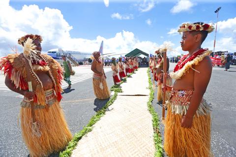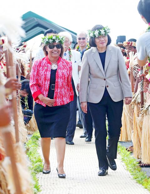 President Tsai Ing-wen (蔡英文) yesterday was greeted by Marshallese President Hilda Heine at the Amata Kabua/Marshall Islands International Airport upon her delegation’s arrival in Majuro.