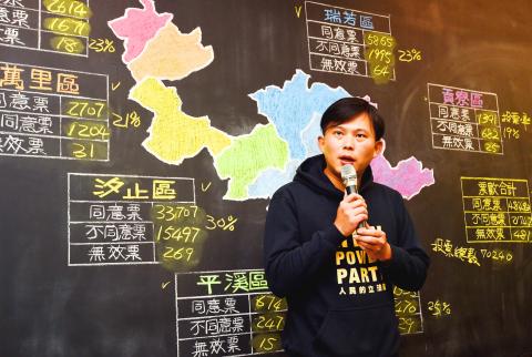 Under the Civil Servants Election and Recall Act (公職人員選舉罷免法), one-fourth of the 255,551 constituents in the electoral district — in this case comprised of Sijhih (汐止), Jinshan (金山), Wanli (萬里), Rueifang (瑞芳), Pingsi (平溪), Shuangsi (雙溪) and Gongliao (貢寮) districts — must vote for the recall of a legislator, and the number of people who vote “yes” must surpass the number of people who vote “no.”