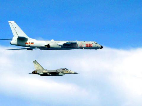 Chinese state media has given broad coverage to “encirclement” exercises near Taiwan this month, including showing photographs of Chinese bombers with what they said was Taiwan’s highest peak, Yushan (玉山), visible in the background.