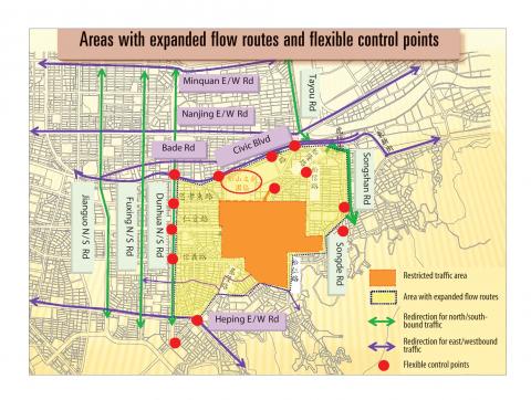About 1,100 officers would be assigned to keep order at the party venue and at nearby intersections, Xinyi Precinct Deputy Chief Chen Shao-hsu (陳少旭) said, adding that counterterrorism police and sniffer dogs would also patrol the area, looking for suspicious people or hidden explosives.