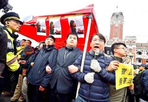 At about 11am, Presidential Office Secretary-General Joseph Wu (吳釗燮) arrived at the site of the protest and urged the legislators to end their demonstration and return to the Legislative Yuan.