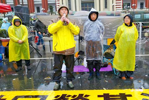 New Power Party (NPP) Executive Chairman Huang Kuo-chang (黃國昌) and four other NPP legislators yesterday continued their hunger strike in front of the Presidential Office Building, demanding that President Tsai Ing-wen (蔡英文) retract a draft amendment to the Labor Standards Act (勞動基準法), despite cold and rainy weather, pressure from police and no response from the president.