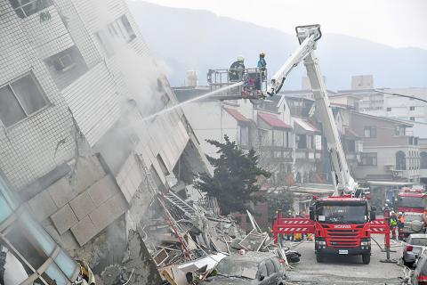 Aftershocks were still being felt as late as yesterday morning, causing the building to continue to tilt south by 1.5cm and west by 0.7cm, East Asia Aeronautics Mensuration Co owner Ni Han-chieh (倪漢傑) said, adding that the increased tilt of the building slowed after teams propped it up with seven steel beams.