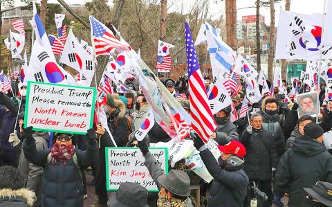 Dozens of protesters demonstrated outside the concert venue, with waving banners condemning Moon and Kim Jong-un.