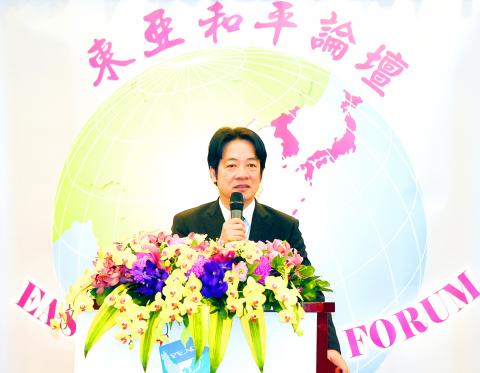 Lai made the remarks at the opening ceremony of the two-day East Asia Peace Forum in Taipei, which was held by the Democratic Pacific Union and cosponsored by South Korea’s 21st Century Economic and Social Research Institute and Switzerland’s Swiss Democracy Foundation.