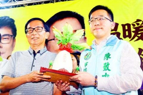 Chen on Saturday last week attended a rally in Kaohsiung for his son, Chen Chih-chung (陳致中), who is leading in opinion polls and is expected to be nominated by the Democratic Progressive Party as one of its Kaohsiung city councilor candidates for the nine-in-one local elections on Nov. 24.