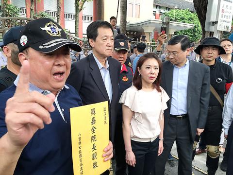 Separately yesterday, veterans group 800 Heroes commander Wu Chi-liang (吳其樑) and spokesman Wu Sz-huai (吳斯懷), who are both retired lieutenant generals, delivered another petition to the Legislative Yuan in Taipei, which was received by Legislative Yuan Deputy Secretary-General Kao Ming-chiu (高明秋).