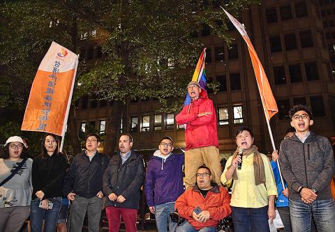 On Tuesday evening, Taiwan Alliance to Promote Civil Partnership Rights (TAPCPR), a group that supports same-sex marriage, staged a demonstration outside the commission building.