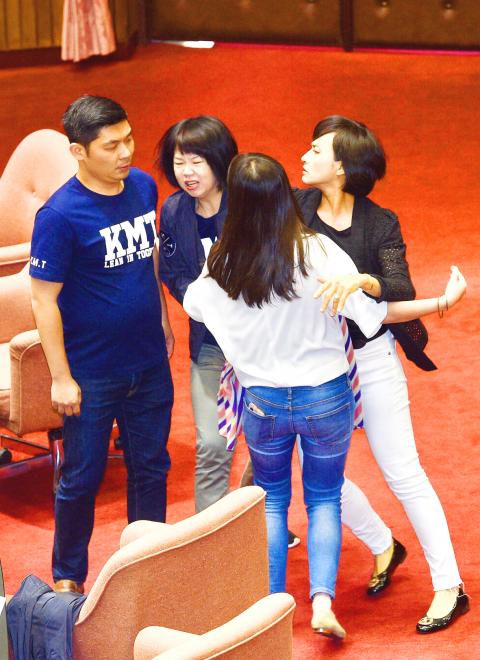 DPP Legislator Chuang Ruei-hsiung (莊瑞雄) began cursing after several KMT lawmakers tried to tackle him, while KMT Legislator Jason Hsu (許毓仁) needed medical attention after scuffling with DPP Legislator Chung Chia-pin (鍾佳濱).