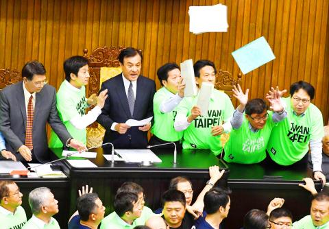 DPP lawmakers, who had been guarding the gates of the legislative chamber in shifts since Thursday, ensured that Legislative Speaker Su Jia-chyuan (蘇嘉全) had a clear path to the speaker’s podium, which was surrounded by KMT lawmakers.