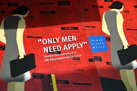 Gender discrimination is widespread in the Chinese workforce, Human Rights Watch (HRW) said yesterday, with many hiring advertisements openly calling only for male applicants and using the attractiveness of female workers as a draw.