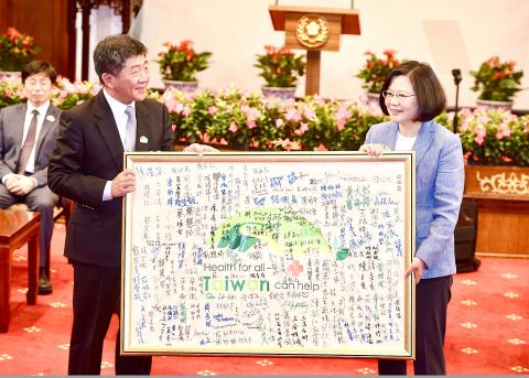 Tsai made the announcement while receiving a delegation led by Minister of Health and Welfare Chen Shih-chung (陳時中), who had just returned from Geneva, Switzerland, where he solicited support from WHO members for Taiwan’s participation in the WHA and touted Taiwan’s role in disease prevention on the sidelines of the 71st WHA meeting.