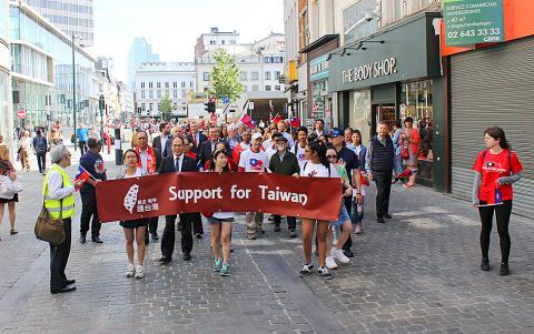 About 250 people, including representatives from Taiwan’s diplomatic allies posted to the EU, pro-Taiwan members of the European Parliament, Belgian lawmakers and other officials took part in the 2km march, which began at the Theatre Royal de la Monnaie at about noon and ended in front of the Taipei Representative Office to the EU.