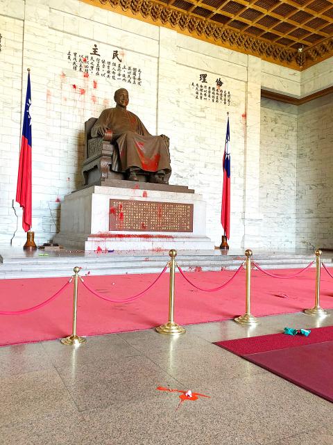 A pro-independence group yesterday called for the complete removal of authoritarian symbols and the closure of mausoleums after they hurled red paint at the 6.3m-tall bronze statue of Chiang Kai-shek (蔣介石) at the Chiang Kai-shek Memorial Hall in Taipei.