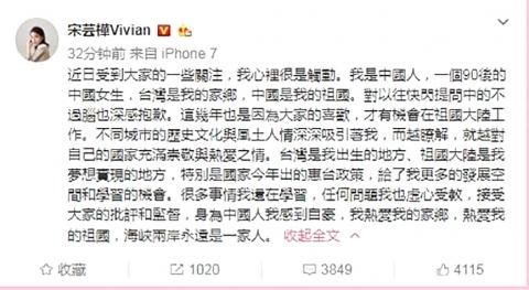Taiwanese actress Vivian Sung (宋芸樺) on Thursday said she was “proud to be Chinese” in an apology after Chinese netizens uncovered a 2015 interview in which she said her favorite country was Taiwan.