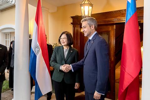 President Tsai Ing-wen (蔡英文) on Tuesday arrived in Paraguay, where she and Paraguayan president-elect Mario Abdo Benitez agreed to further expand cooperation.