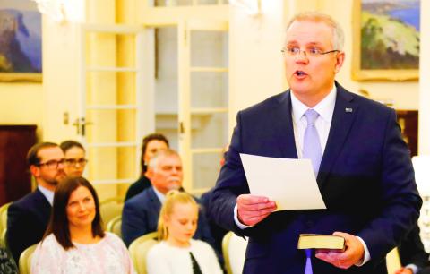 Former Australian treasurer Scott Morrison yesterday was sworn in as the nation’s seventh prime minister in 11 years, after a stunning party revolt against Malcolm Turnbull, which the new leader said had left the government “bruised and battered.”