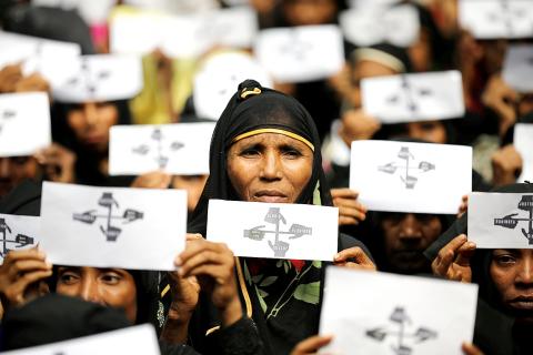 Thousands of Rohingya Muslim refugees yesterday marked the one-year anniversary of the attacks that sent them fleeing to safety in Bangladesh, praying they can return to their homes in Myanmar and demanding justice for their dead relatives and neighbors.