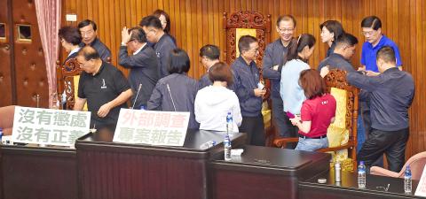 Lai’s report was delayed for two hours yesterday morning by KMT legislators, who occupied the speaker’s podium and chanted: “No punishment, no justice.”