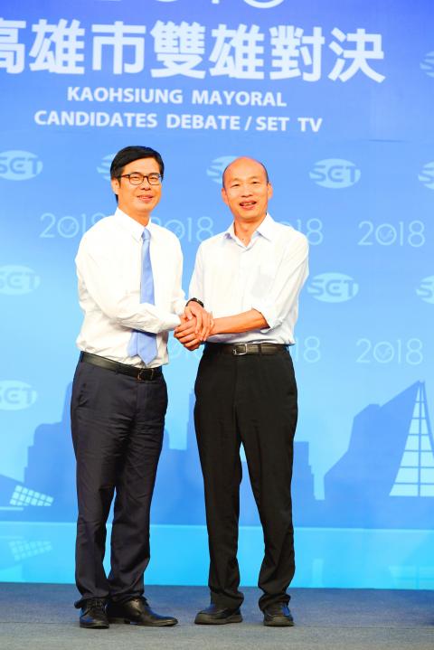 The two-hour debate, broadcast by Sanlih E-Television, began at 8pm with the DPP’s Chen Chi-mai (陳其邁) and the KMT’s Han Kuo-yu (韓國瑜) delivering their opening statements. There were two rounds of questioning before the debate ended with final statements from each candidate.